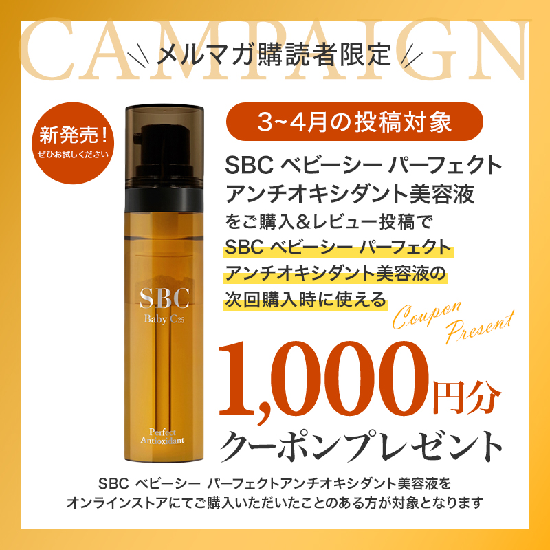 ただいま、期間中にSBC ベビーシー パーフェクトアンチオキシダント美容液のレビューを投稿いただいたお客様にSBC ベビーシー パーフェクトアンチオキシダント美容液の次回購入時に使える1,000円分のクーポンプレゼントキャンペーンを開催中です!